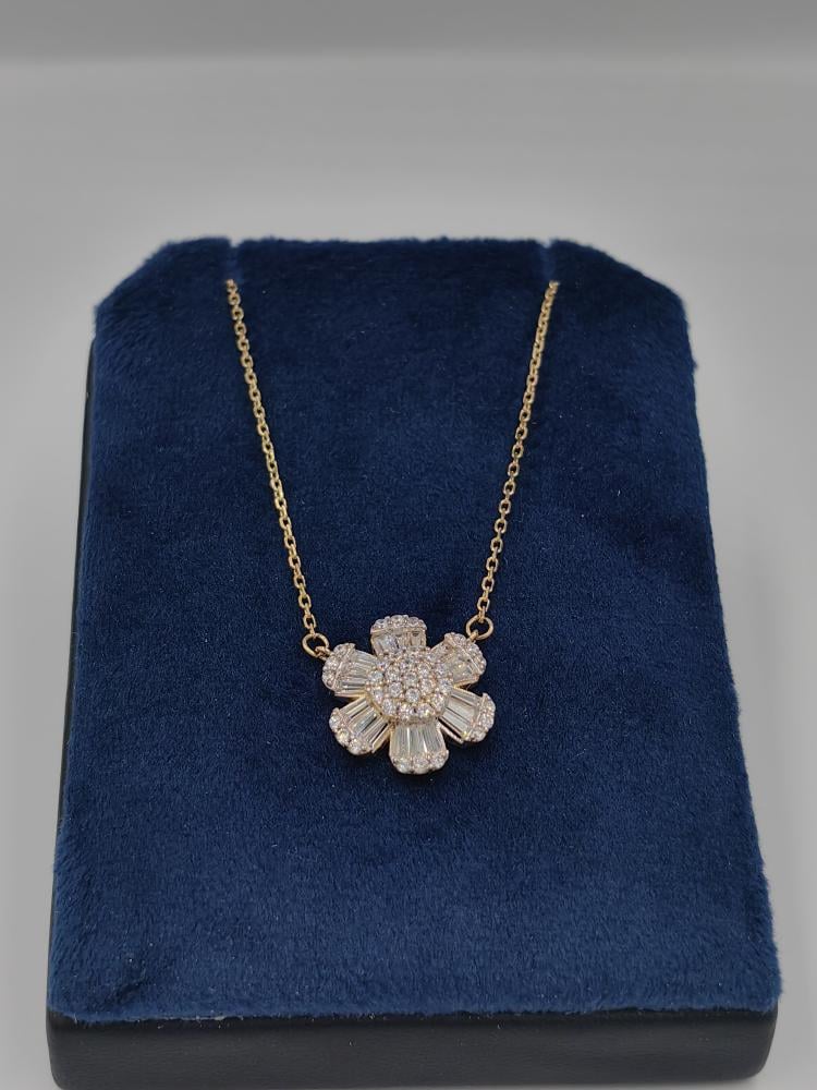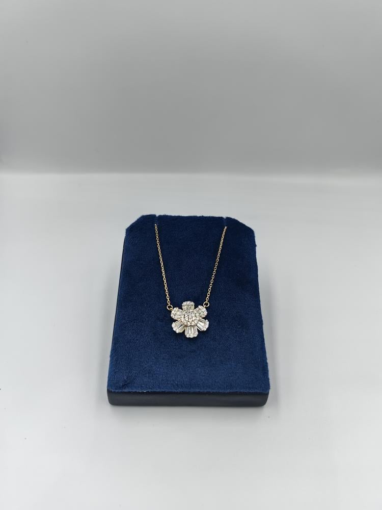 تتميز التعليقة بتصميم زهرة متفجرة، حيث تتكون البتلات من أحجار الزركون بقصّة الباغيت التي تشع من المركز، محاطة بإطار مرصّع بأحجار دائرية. أما قلب الزهرة، فهو عنقود متلألئ من أحجار الزركون الدائرية، ليخلق وهجاً ساحراً يحاكي بريق الألماس في أرقى صوره.