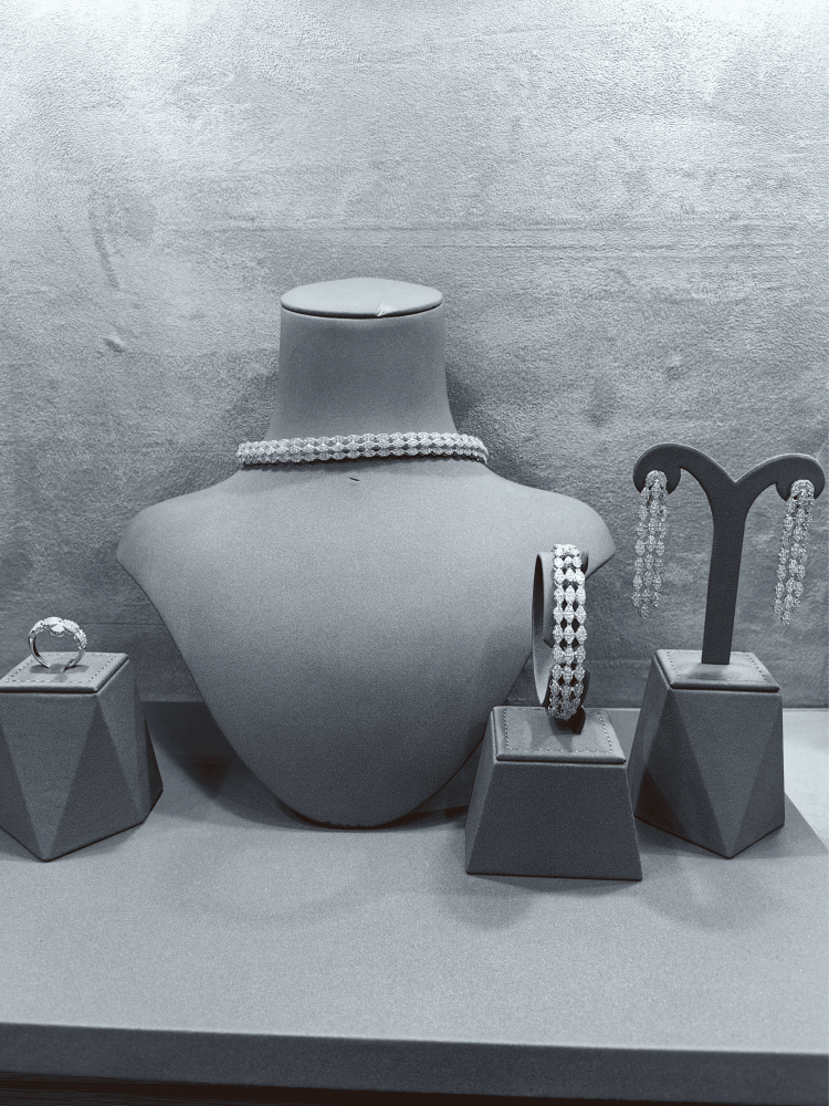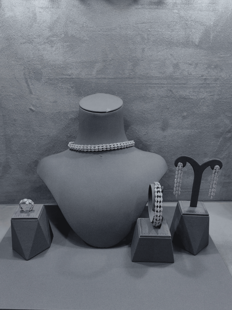 يتميز الطقم بتصميم "فانسي" معقد ومتناغم، حيث تتشابك صفوف من أحجار الزركون الفاخرة لتخلق شبكة متلألئة من البريق الذي ينسدل بأناقة. تصميم ملكي يجمع بين الرقة الكلاسيكية والجرأة الهندسية.