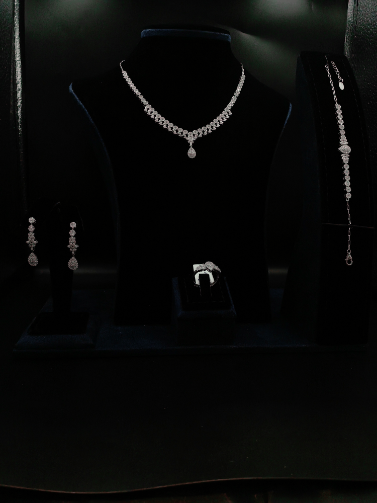 أضيئي إطلالتكِ بلمسة من الفخامة الكلاسيكية المتكاملة مع طقم "قطرات الندى"، المصمم ليكون رفيقكِ في أهم مناسباتك. صُنع هذا الطقم الاستثنائي بالكامل من الفضة الإسترلينية الخالصة عيار 925، ليعكس ذوقكِ الرفيع ويضمن لكِ جودة لا تضاهى.