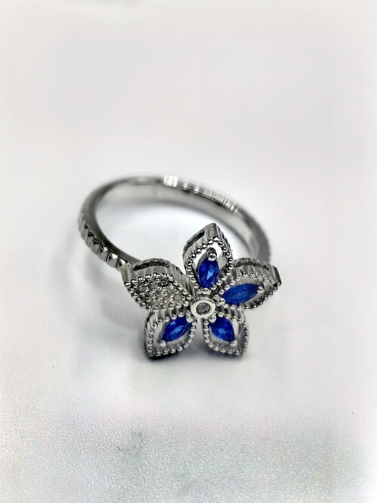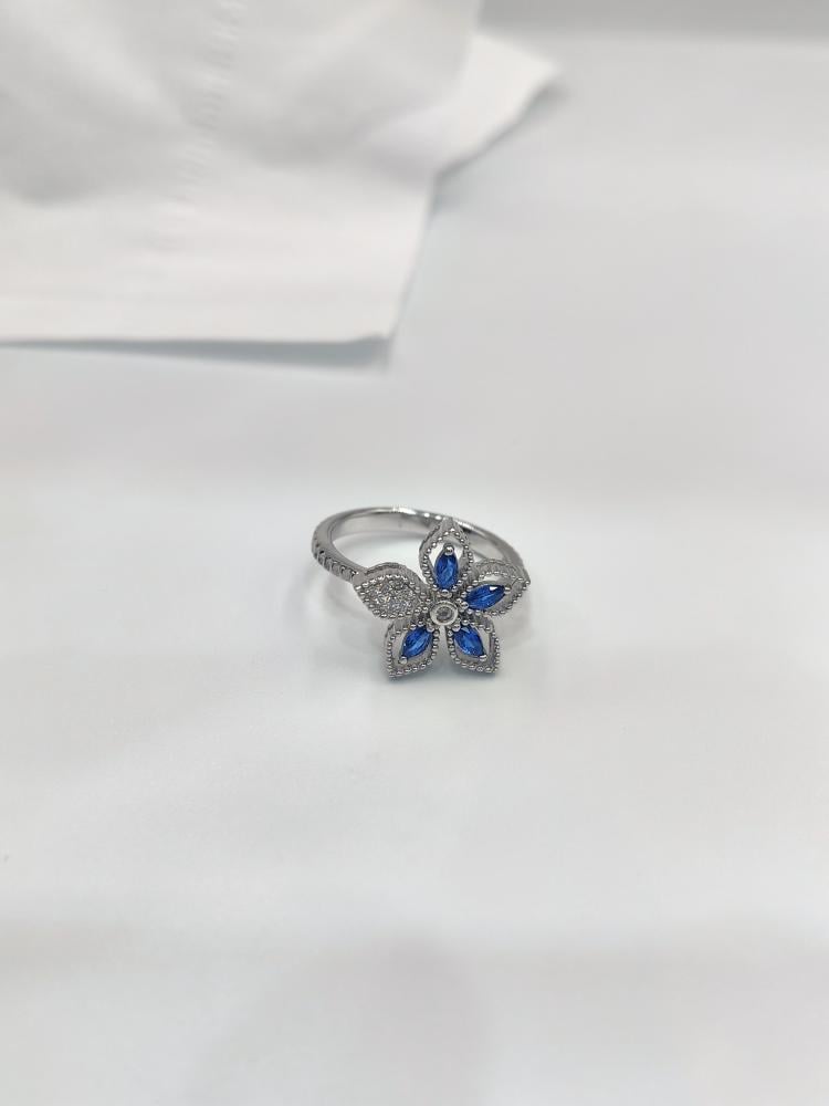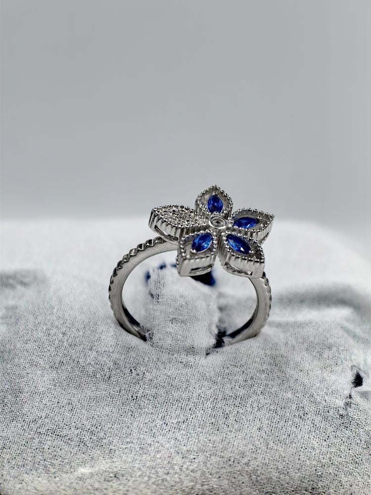 يتميز الخاتم بتصميم زهرة متفتحة، حيث تتكون البتلات من أحجار الزركون الزرقاء الزاهية بقصّة الماركيز، والتي تحاكي لون الياقوت الملكي. تتوسط الزهرة دائرة من الزركون الأبيض البراق، وتكتمل اللوحة الفنية ببتلة إضافية مرصّعة بالزركون الأبيض على جانب الحلقة.
