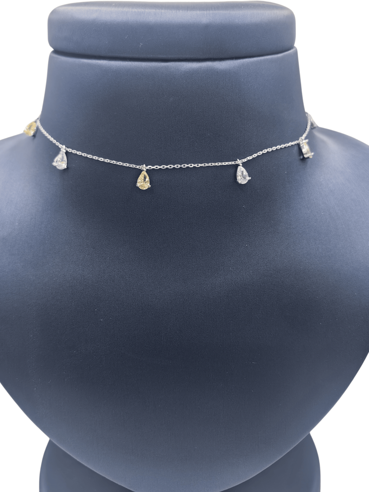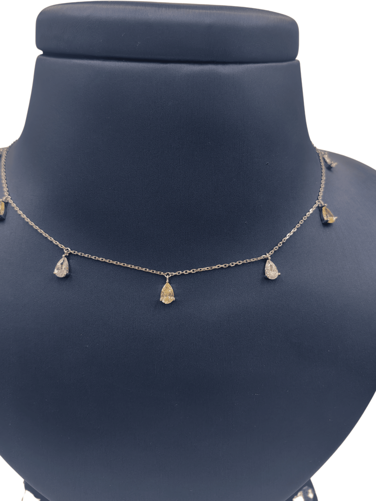 تتدلى من سلساله الناعم قطرات متلألئة بقصّة الدمعة (Pear cut)، في تناغم لوني ساحر يجمع بين بريق الألماس الأبيض النقي ودفء الألماس الأصفر الكناري النادر. هذا المزيج الفريد يخلق قطعة فنية تنبض بالحياة والبهجة.