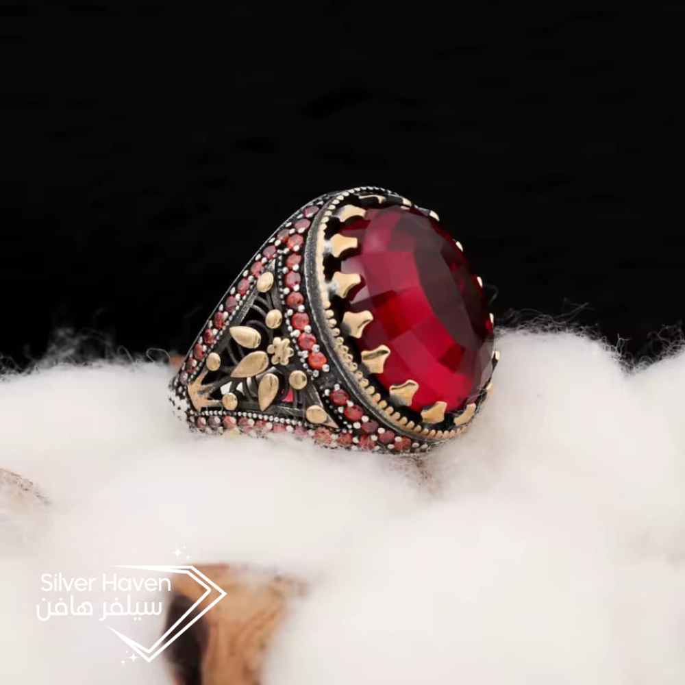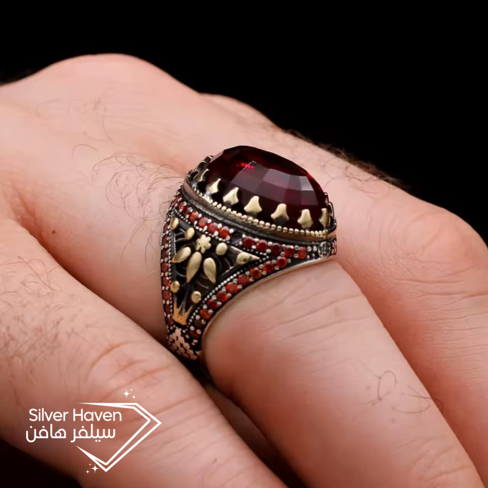 يتميز خاتم رجالي فضة بحجر عقيق أحمر بتصميم فريد، فهو مُصمم بعناية ليعكس الذوق الرفيع والأناقة. إليك أبرز مواصفات خاتم فضة استرليني من متجر Silver Haven: